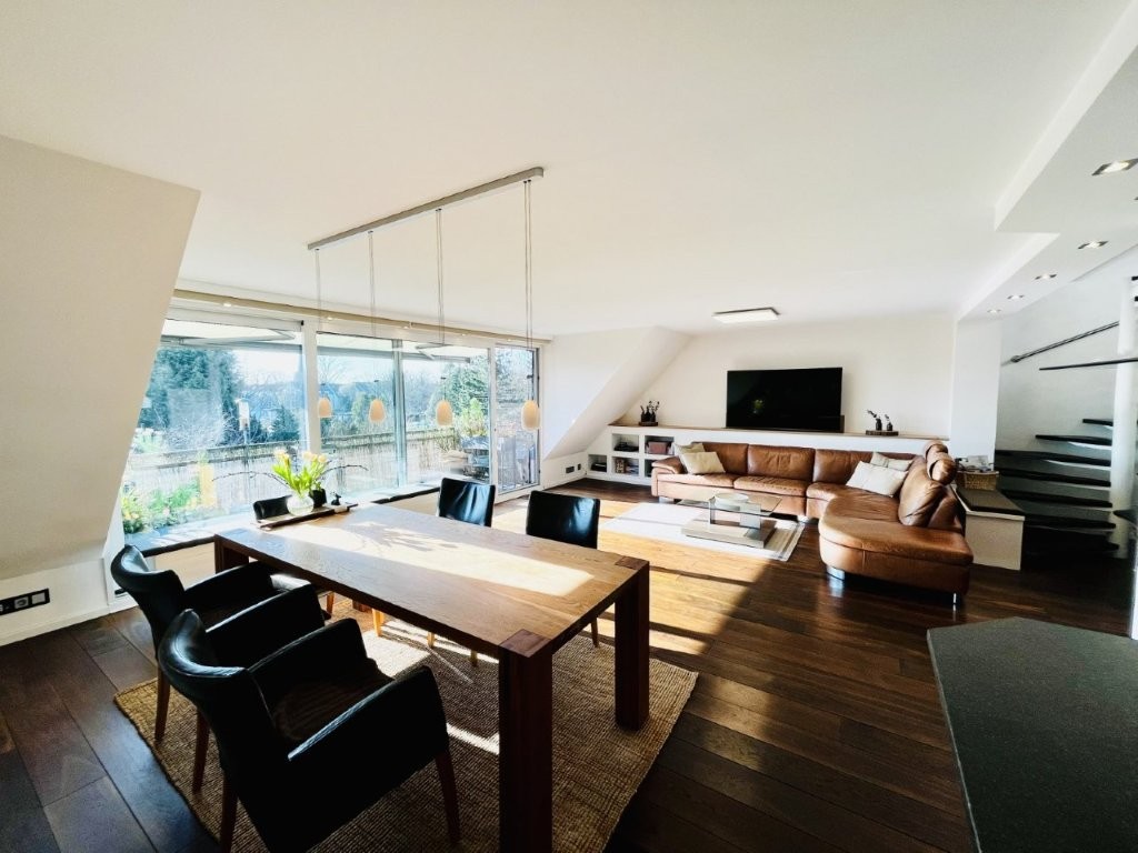 Diese außergewöhnliche Eigentumswohnung verbindet modernes Design mit dem besonderen Flair einer Maisonette: Auf zwei Ebenen erwartet Sie ein großzügiges, lichtdurchflutetes Zuhause, das Geborgenheit und Offenheit zugleich schenkt. Bodentiefe Fenster und offene Raumgestaltung schaffen ein unvergleichliches Ambiente – mit Blick auf Wiesen und Pferdekoppeln, das an eine grüne Oase erinnert und doch mitten in der Stadt liegt.