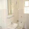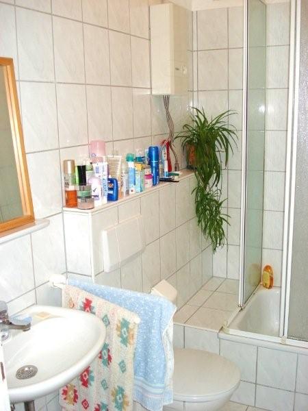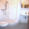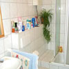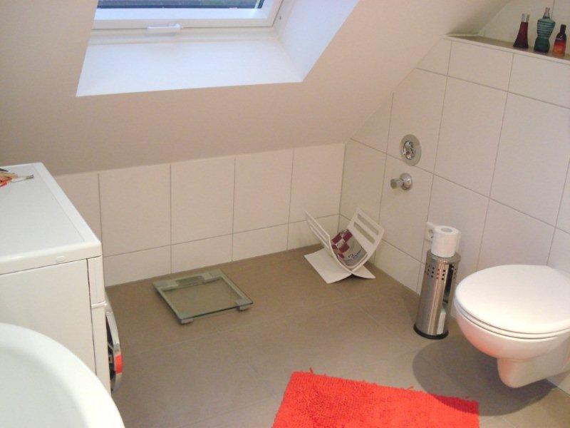 Das hell geflieste Tageslichtduschbad verfügt über WC, Urinal, Waschtisch mit Spiegel- und Unterbauschrank sowie einen Waschmaschinenanschluss.