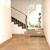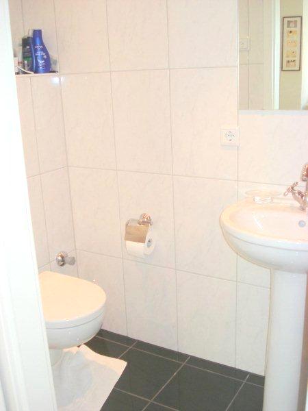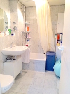 Das anspruchsvolle, hell geflieste Duschbad mit WC und dunklem eleganten Granitboden verfügt über einen Waschmaschinenanschluss.