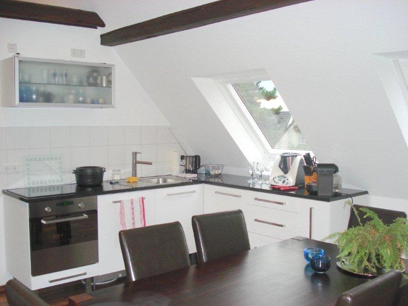 Die optimal eingepasste Einbauküche strahlt mit Hochwertigkeit u.a. durch die schwarze Granitarbeitsplatte und bietet Ihnen viel Komfort.