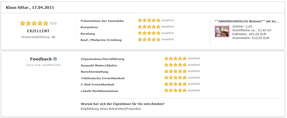 Auch freue ich mich, dass mein persönlicher Eindruck von Ihrer Arbeit – und der ist maßgebend für die Entscheidung meine Wohn-Immobilien immer durch Sie anbieten zu lassen – von professioneller Seite bestätigt wird.