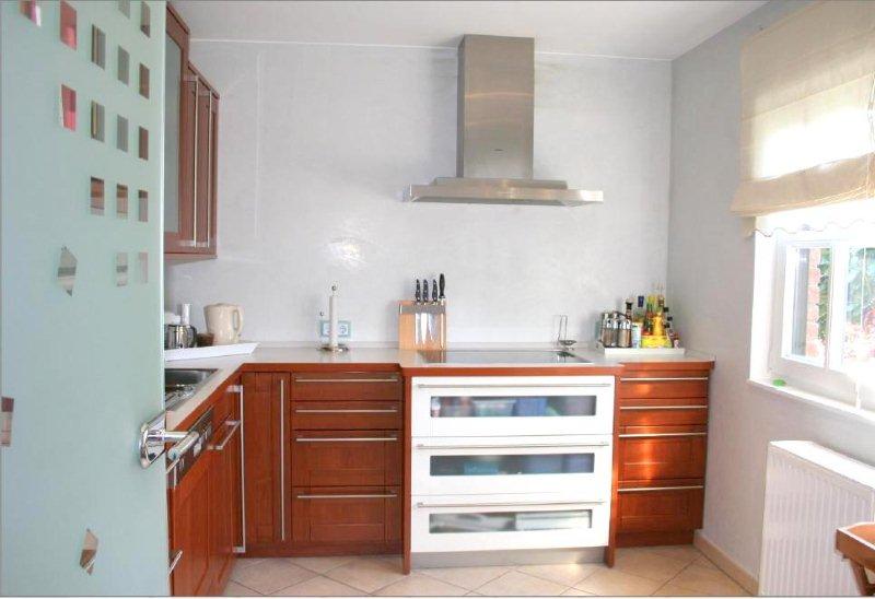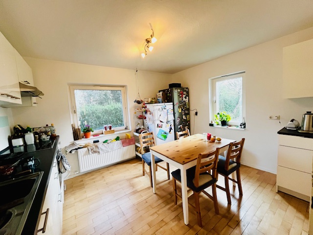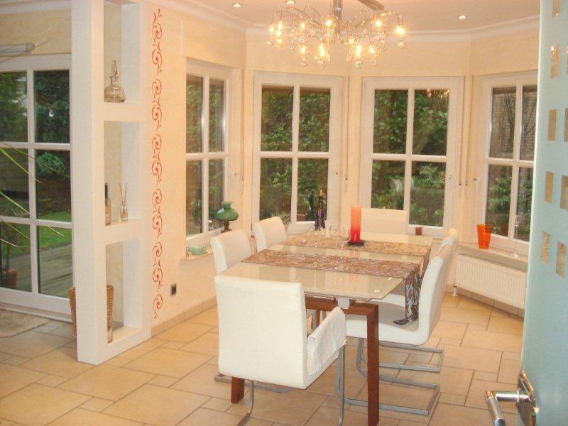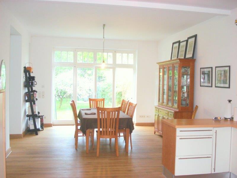 Vor der Küche, die mit einer Einbauküche vollausgestatteten ist, befindet sich im Esszimmer reichlich Platz für Ihren wohnlichen Essbereich der praktischerweise mit einer Durchreiche mit der Küche verbunden ist.